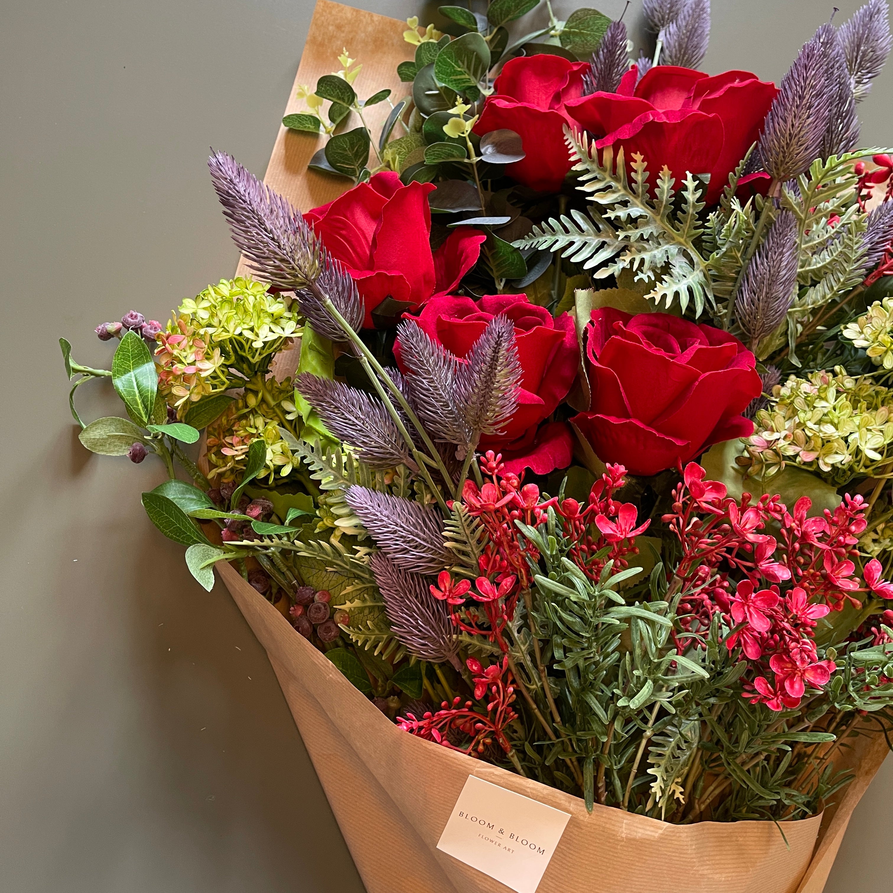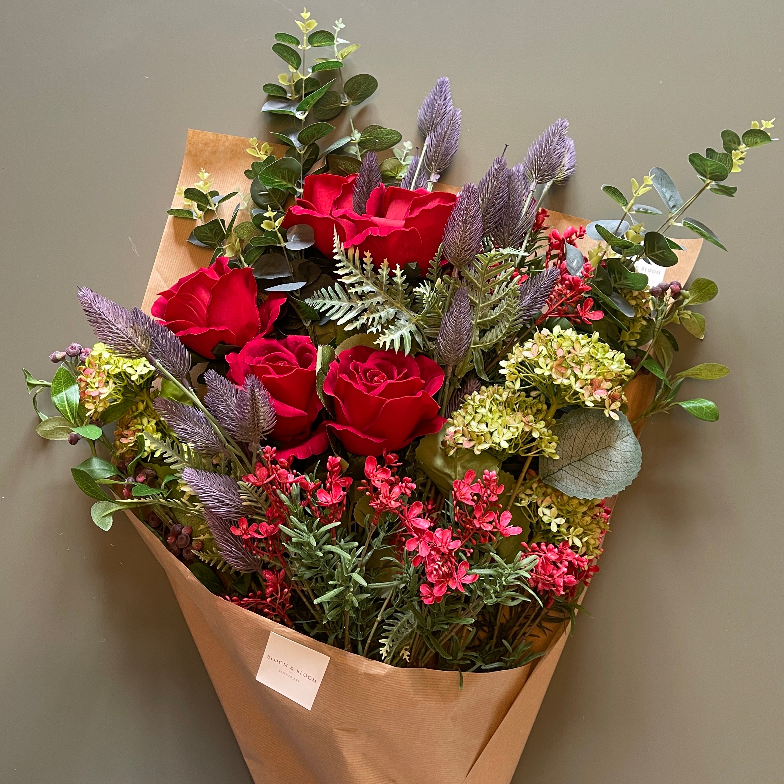 Rich, sultry and effortlessly cool. Elizabeth is a statement arrangement full of depth and drama. Featuring velvety red roses, dusky eucalyptus, soft broom broom and viburnum, it's laced with hints of purple and lush greenery for a bold moody edge. Available in both 20 and 40 stems.